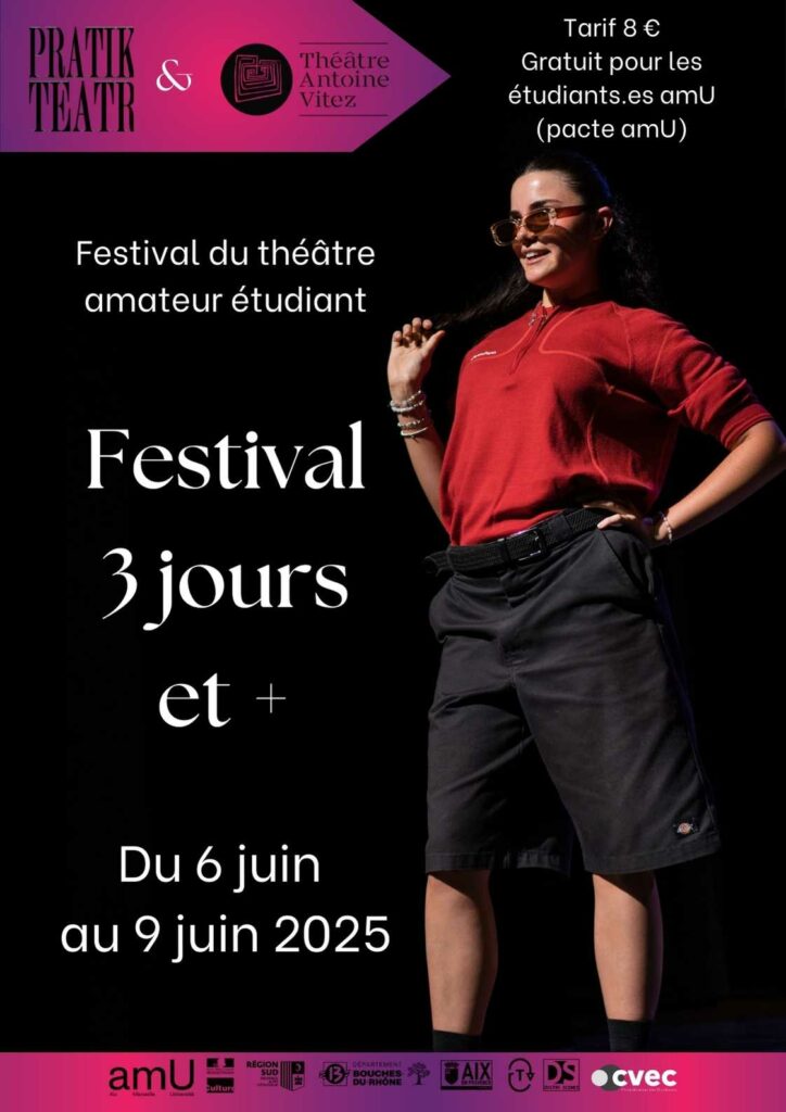 À la croisée d’une logique de formation et d’une politique de pratique artistique amateur, ce temps fort du théâtre étudiant accueille les spectacles créés dans les 10 ateliers de théâtre amateurs organisés par Pratik Teatr, la Direction Culture et Société et le théâtre Antoine Vitez sur les campus d’Aix et de Marseille.